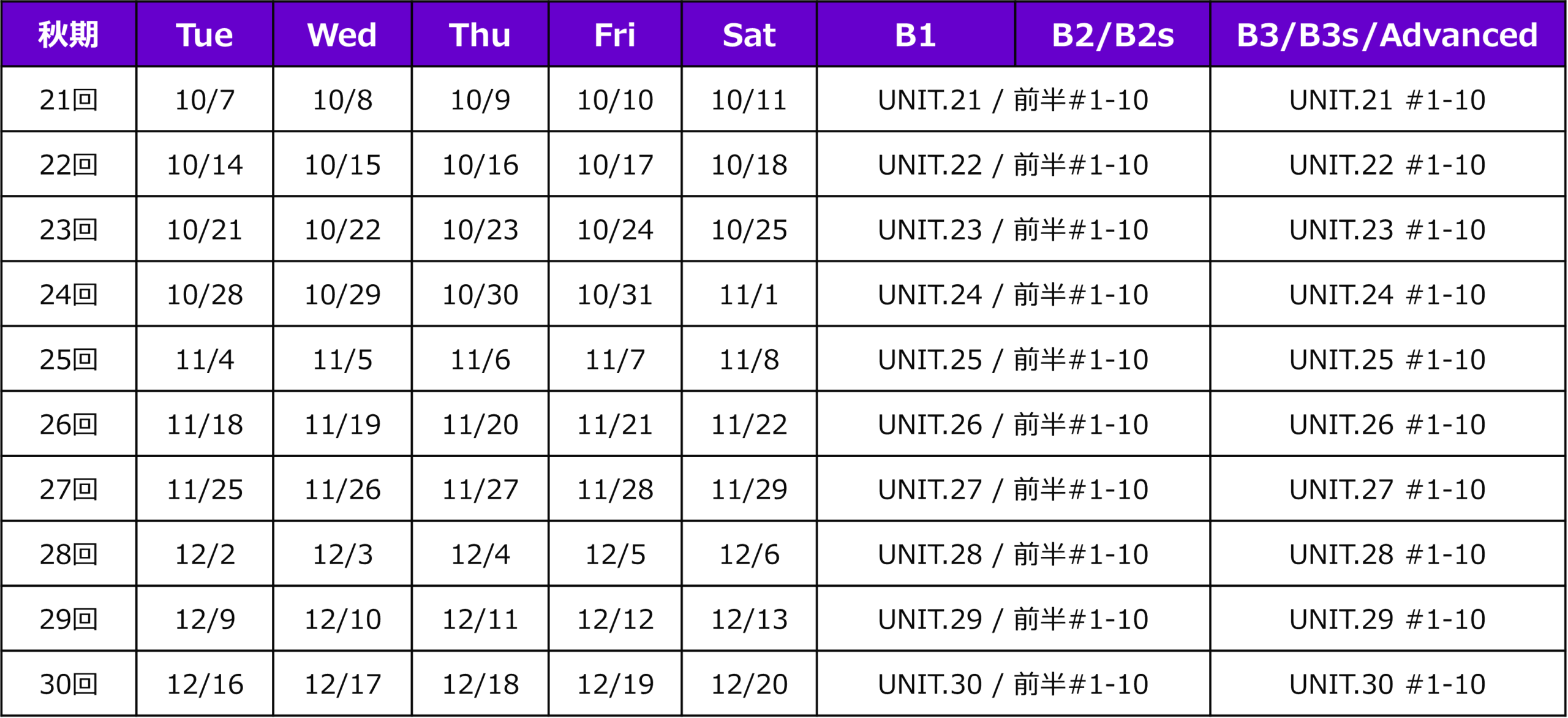 - 春期、夏期、秋期、冬期に分かれており、各期に10レッスンを行います。